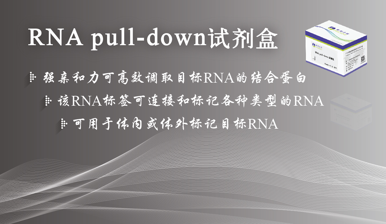 RNA pull-down是檢測RNA及其結(jié)合蛋白(RNA binding protein,RBP)之間相互作用的主要實驗手段之一。生物素-RNA pull down試劑盒利用體外轉(zhuǎn)錄的生物素標記RNA來模擬天然RNA分子,作為探針,與樣本裂解液孵育,探針與裂解液中的蛋白形成RNA-蛋白質(zhì)復(fù)合物;通過鏈霉親和素磁珠與生物素之間的強親和力,特異性捕獲生物素標記的RNA,從而實現(xiàn)RNA結(jié)合蛋白(RBPs)的捕獲富集;之后可以采用Western Blot技術(shù)檢測特定蛋白,也可以采用質(zhì)譜(LC-MS/MS)技術(shù)鑒定未知蛋白。